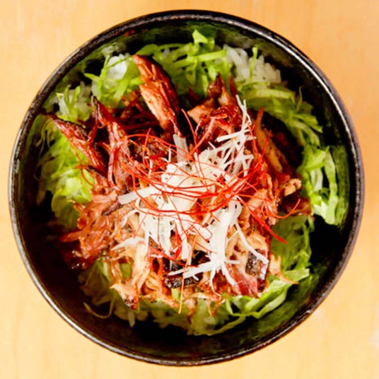 BEBE's KITCHENアメリカ三大BBQのプルドポークを豪快に丼しにしました。なかでも特盛はご飯は大盛り、肉は1.5倍と食べ応え抜群です!