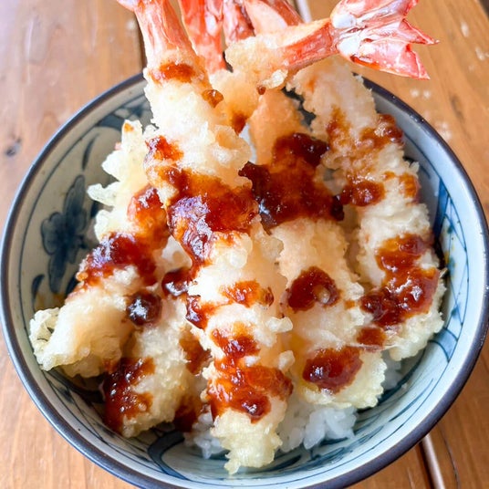 上々丁寧に下処理したエビをカラッと天ぷらに!直火の釜で炊いた熱々のお米にのせて、天丼のタレをかければエビ天丼の完成!ぜひご賞味ください。
