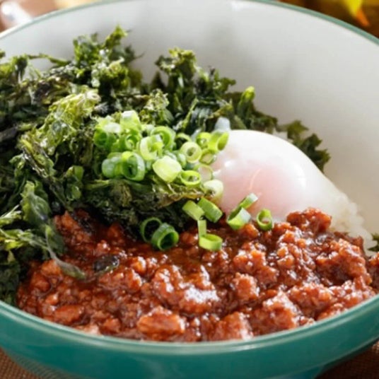 ぞうめし屋炊きたてご飯の上に、ぞうめし屋の自慢の肉みそとパリパリの焼き海苔と温泉玉子を乗せた間違いなし!の一品です。