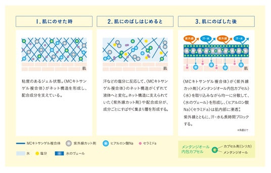 - 肌表面の汗などの塩分に触れると<MCキトサン複合体>がくずれて、水分や油分に強い<水のヴェール>に変化。紫外線とともに、汗や水も長時間ブロックします。