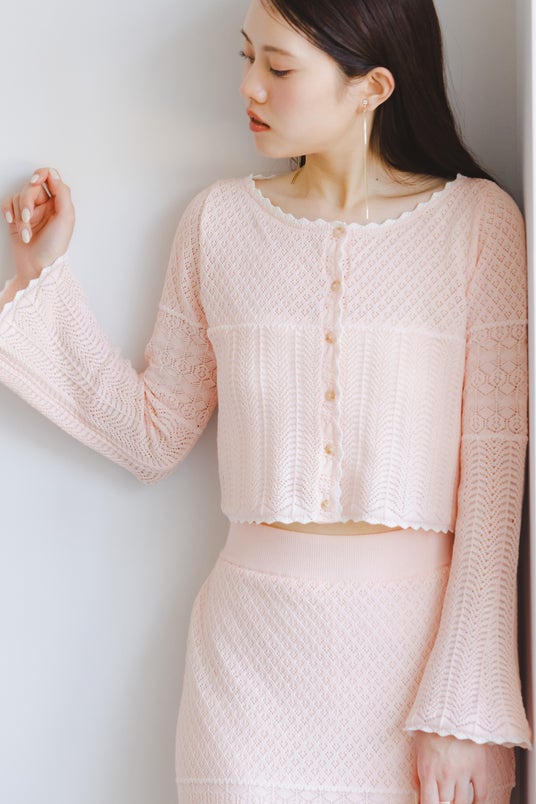 コットン素材の風合いと細やかなクロシェ柄がマッチした、トレンド感のあるクロシェニットセットアップ。襟ぐりや前立て、裾や袖口を配色使いのレース編み風に仕立て、ポイントにステッチを効かせるなど細部にもこだわって作ったアイテムです。