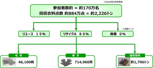 オンワードグループのサステナブル経営推進の一環として、ご愛用いただいた自社の衣料品を回収し、リユース・リサイクルを通じて、衣料品循環システムの構築を目指す取り組みです。2009年にスタートし、2024年度までで、累計約170万名のお客さまから約884万点の衣料品を回収しました。