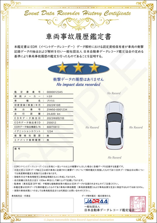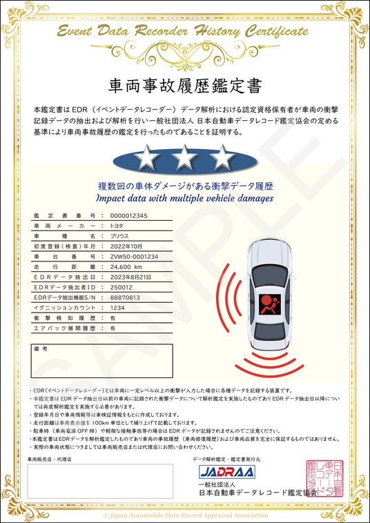 一般社団法人日本自動車データレコード鑑定協会(JADRAA)(所在地:東京都中央区、代表理事:伊藤 久雄)は、このたび設立し、国内初※となるEDR(イベント・データ・レコーダー)を利用した中古車事故履歴鑑定サービスの提供を開始いたします。