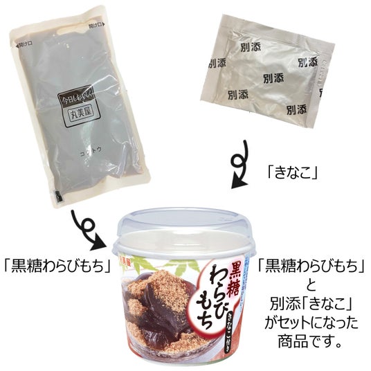 ・レトルトの「黒糖わらびもち」と、別添の「きなこ」がセットになったカップ入りです。