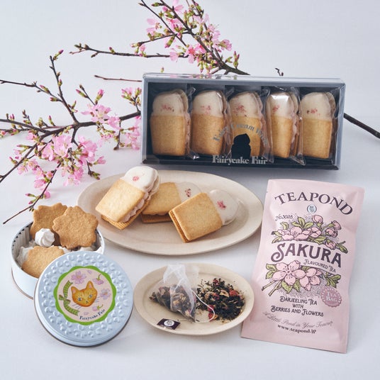 桜の風味を存分に楽しめる、桜シーズン限定のサクラのお菓子セットです。桜の爽やかな香りと甘じょっぱさが楽しめる「フェアリークリームウィッチ サクラ生バターサンド」と「プチカドーサクラ」、そして、ティーポンドの咲き誇る満開の桜をイメージした紅茶「サクラ」を組み合わせました。桜の季節にぴったりな上品な味わいをお楽しみいただけます。オンラインショップ限定となる本セットは、贈り物やお花見、ホームパーティーなど、春のお集まりに最適。今だけの特別な味わいをお楽しみください。