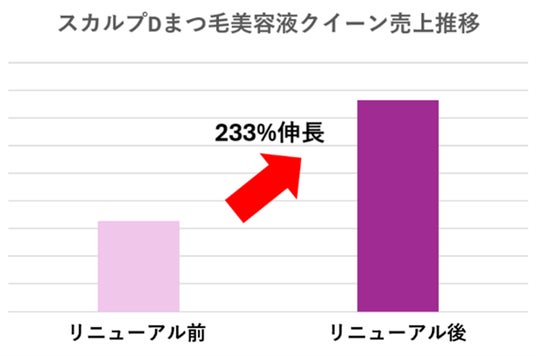リニューアル後、「スカルプDまつ毛美容液 クイーン」は、美容誌や美容メディア,SNSなどで多くの方にご好評をいただき、リニューアル発売前から売上約230%伸長※7を達成いたしました。
