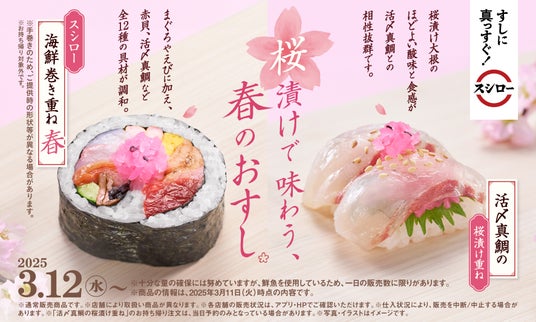 株式会社あきんどスシロー(本社:大阪府吹田市、代表取締役社長:新居 耕平)は、春らしく桜漬けを合わせた創作すしや国産わさびを使った手巻のおすしなど、春のグランドメニューを3月12日(水)より全国のスシローにて販売開始いたします。
