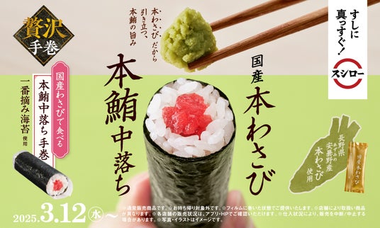また、本鮪の中落ちを極上海苔と国産わさびでお楽しみいただける「国産わさびで食べる本鮪中落ち手巻」も登場します。本鮪ならではの濃い旨みと香りが特長の中落ちを店舗ですき身にし、歯切れ良く香り高い有明海産の一番摘みの極上海苔と、国産わさびのさわやかな香りと辛みを合わせた贅沢な手巻です。国産わさびは小分けしたパックでご提供することで、お客さま自身でお好みの量を調節してお楽しみいただけます。