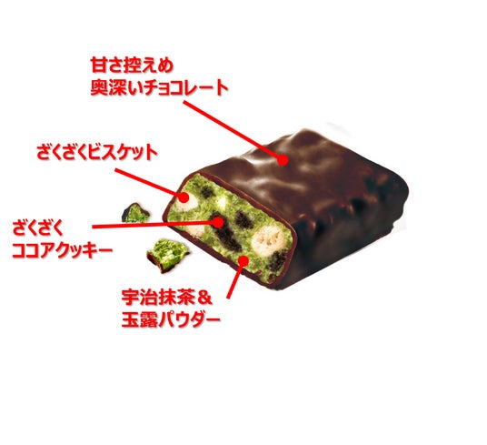 また、抹茶の旨味や渋みと相性の良い、甘さを控えたビター感のあるチョコレートをコーティングすることで、抹茶のおいしさを最大限引き出しています。濃い抹茶とチョコレートの味わいがざくざく食感とマッチした絶妙なおいしさをお楽しみください。