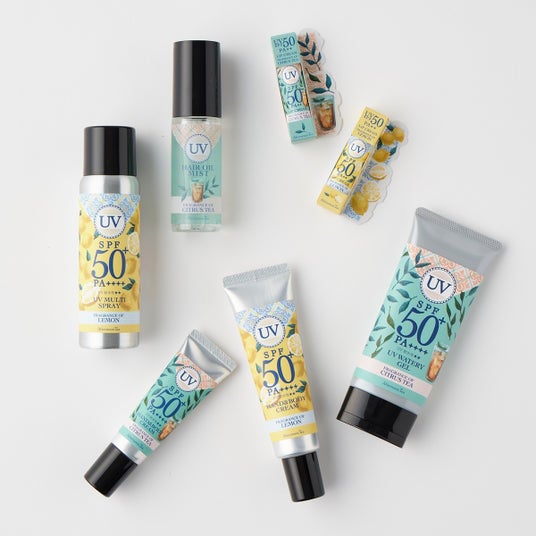 UVマルチスプレー ¥2,200、UVヘアオイルミスト ¥2,200、UVリップクリーム 各¥1,430、UVハンド&ボディクリームS ¥1,430、UVハンド&ボディクリームL ¥1,980、UVウォータリージェル ¥1,980