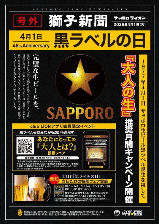 4月1日は「黒ラベルの日」!全国の銀座ライオン・銀座ライオンLEOなどで「大人の☆生」推奨キャンペーン開催中
