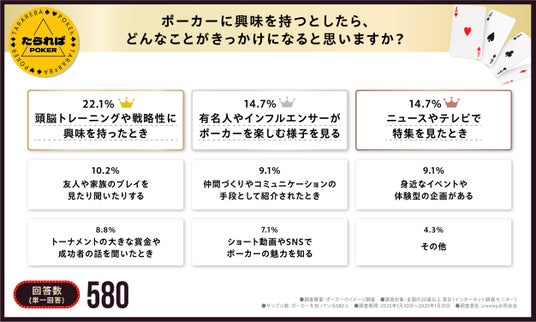 最も多かったのは「頭脳トレーニングや戦略」ということで、新時代の脳トレとして今後ポーカーが世代を超えて人気が高まってくるかもしれません。