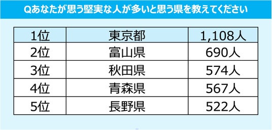 堅実な人が多いイメージランキングは1位『東京』(投票数1,108人)という結果に。選んだ理由としては「情報量が多く経験値を多く得られる」「物価が高いからお金に堅実でないと住めない」という理由が多数でした。2位『富山』(投票数690人)は、「持ち家率が高いイメージ」「真面目な印象」「勤勉であまり冒険をしない」など、人生の大きな買い物のひとつである持ち家に関するイメージから投票率が高い結果に。3位『秋田』(投票数574人)は、「学力が高い」「真面目で嘘が大嫌いな性格の人が多い」など、真面目で勤勉なイメージをもたれる方が多い傾向でした。また、上位5位までの結果を見てみると、東京以外は東北・北陸が上位を占めており、日本の東側と西側ではイメージに差が出る結果となりました。