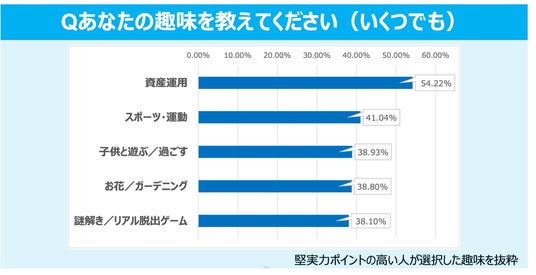 堅実力ポイントが高い人(12ポイント以上)の趣味を見てみると、「資産運用」が趣味の人の割合が54.22%(1,525人/堅実度が高い人827人)と最も多いですが、「謎解き/リアル脱出ゲーム」が趣味であると回答した人も38.10%(328人中/堅実度が高い人125人)と、一見堅実性とは直接的なつながりがないように思えますが、堅実力ポイントが高い人に多い趣味であるという結果になりました。