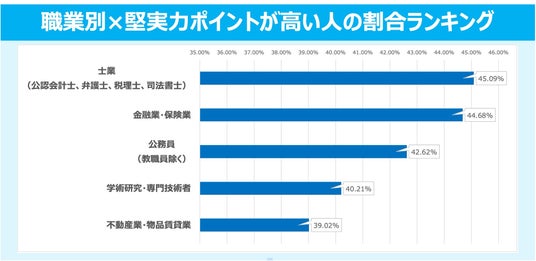 職業別×堅実力ポイントが高い人(12ポイント以上)で見てみると、堅実力ポイントが高い人の割合が多い職業は「士業(公認会計士、弁護士、税理士、司法書士)」で45.09%(51人中/堅実度が高い人23人)と、約2人に1人堅実度が高くトップに。