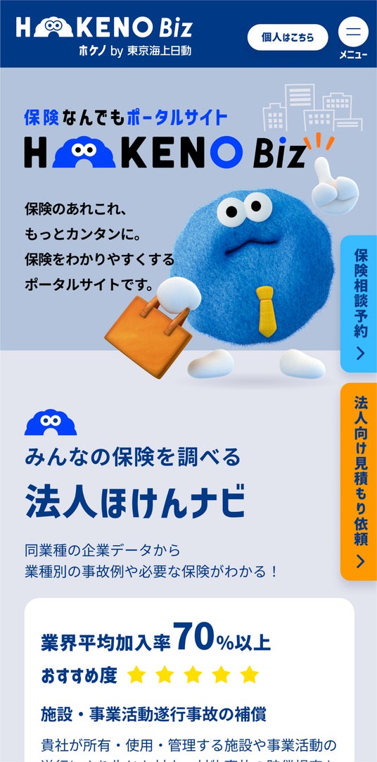 HOKENO(ホケノ)は、「”わからない”を、”あんしん”に変える。」ことをミッションとして掲げ、保険をもっとお客様にとって分かりやすく、身近なものに変えていくべく、最新のAI技術と豊富なデータの分析に、保険の専門家である代理店の高品質なコンサルティングサービスを組み合わせ、お客様一人ひとりのニーズに寄り添った、快適で納得感のある保険体験を提供するサービスです。今回新たに「リスク診断機能」を追加し、ユーザーを7つのリスクタイプに分類・特徴を診断し、タイプに応じて保険商品選択時の注意ポイントや、HOKENOサービスの利用方法等のアドバイスを受けることが可能となりました。また、「ホケノマガジン」では、リスクソリューション、資産運用、各種ランキングやユーザー意識調査など、リスクに関わるさまざまな情報を提供します。さらに、法人のお客様向けに、法人版の「保険診断」、「保険相談」、「オンラインプラン作成依頼」、「情報発信サービス」などを提供していく「HOKENO Biz」 専用サイトを開設。法人に特化した情報、サービスを提供することで、法人のお客様のリスクマネジメントをより効果的かつ効率的にしていくことを目指してまいります。
