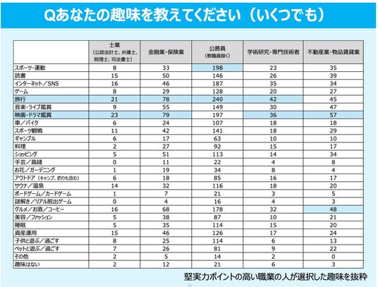 さらに、堅実力ポイントが高い職業の方の趣味で見てみると、しっかりと貯めて非日常に投資するイメージの「旅行」が上位に。