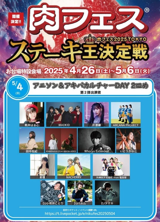 今後も、他日程のステージ内容や出演者情報を発表予定です。肉フェスでしか楽しめないステージパフォーマンスとともに、極上の肉料理を堪能できる贅沢な11日間をお届けします!