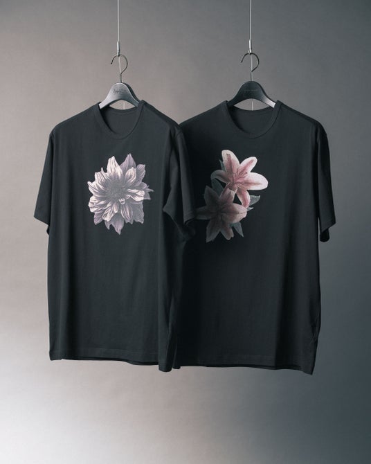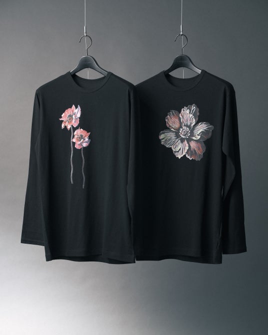 また、同モチーフを用いたカットソーは、半袖2型、長袖2型の全4型を展開。花一輪を顔料プリントで表現し、時間の経過とともに風合いを増していく仕上がりとなっています。