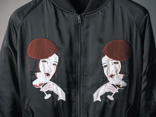 ブラックの100%シルク素材を使用し、両胸にはベレー帽をかぶった女性のモチーフをアップリケ刺繍で表現。柔らかなシルクの質感にワークウェアの要素を落とし込み、刺繍とアップリケによって女性の表情を丁寧に描き出しています。