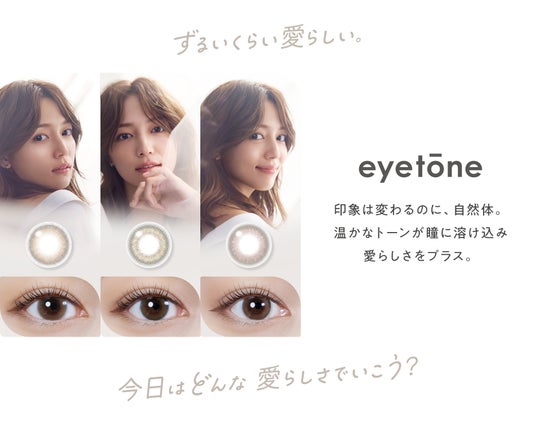 『ずるいくらい愛らしい。』をキャッチコピーに、大人の愛らしさを引き出す『ニュアンストーン』で展開されたカラーコンタクトレンズです。 3色の持つ愛らしさはそれぞれで、今日選んだ愛らしさでもっと魅力的になれますように……eyetoneにはそんな願いが込められています。