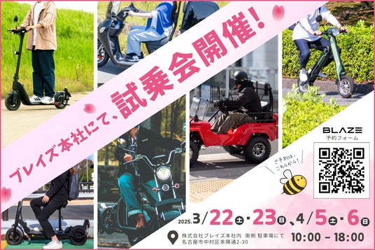 株式会社ブレイズ(愛知県名古屋市、代表取締役:市川秀幸、以下ブレイズ)は、2025年3月22日(土)・23日(日)と、4月5日(土)・6日(日)の計4日間、ブレイズ名古屋本社にて、新商品「スマートEV 特定原付モデル」をはじめとする弊社の小型電動モビリティ商品の試乗会および展示車両即売会を開催いたします。