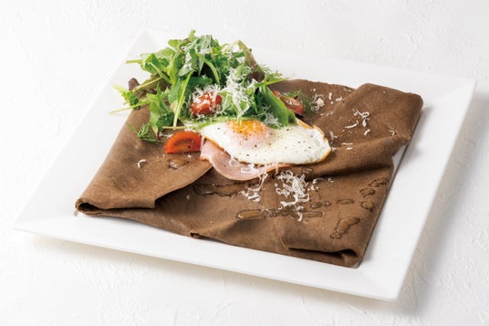 福井県産そば粉を使用したカカオ生地で作る本格カカオガレットにリニューアル。カカオフルーツドレッシングのサラダを添えたお食事クレープです。