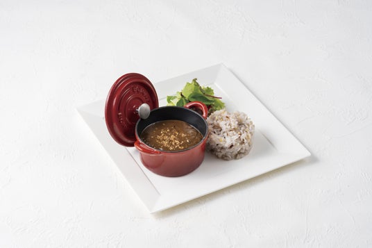 十六穀米のカカオカレー 1,580円(税込)ゴディバのチョコレートやオリジナルカカオデュカを使用したカレーです。ヘルシーで香ばしい雑穀米と一緒にご提供します。カカオデュカとは…アーモンドやカシューナッツ等のナッツ類とクミンやコリアンダー等をココアパウダーであえた、オリジナルスパイスです。(イートインのみ)