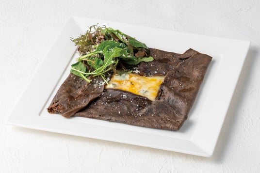そば粉のカカオガレット クワトロ フォルマッジョ 1,420円(税込)ゴルゴンゾーラ・レッドチェダー・モッツアレラ・グラナパダーノの4種類のチーズを使用し、ダークチョコレートでコクを出したガレットです。(イートインのみ)