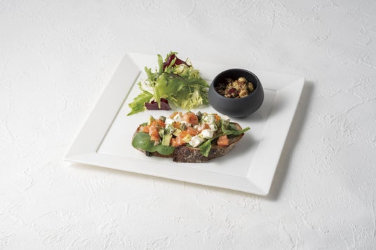 サーモンとアボカドとクリームチーズのタルティーヌサンド 1,490円(税込)サーモンとアボカドとクリームチーズを、カカオフルーツのドレッシングとディルでマリネしたタルティーヌをたっぷりのせました。ほんのりわさびオイルが香る、カンパーニュのオープンサンドです。