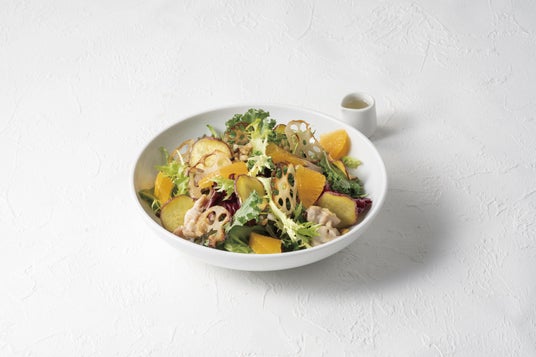 デコポンと根菜のローストチキンサラダ 1,550円(税込)フレッシュのデコポンやローストした根菜のチップスを使用した季節のサラダです。カカオフルーツとホワイトバルサミコのオリジナルドレッシングでお召し上がり下さい。