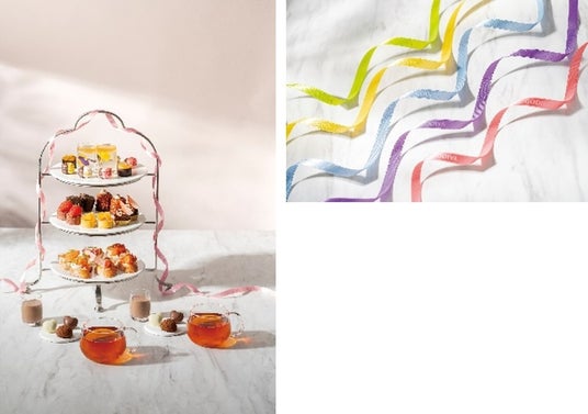 また、リボンの色をお選びいただけるようになりました。赤・ライトグリーン・黄・ライトブルー・パープル・ピンク・オレンジ・緑・黒・白より、お好きな色を、ご予約時にお申し付けください。また、今季のアフタヌーンティーセットには、春らしい桜色のリボンも追加でご用意しました。