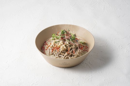 帆立とアサリの豆乳温蕎麦~カカオ黒七味添え 1,200円(税込)帆立・アサリ・赤イカをソテーし、生海苔と豆乳を使った、磯の香りとまろやかな味わいの温かい蕎麦です。カカオを使った特性黒七味を添えて提供します。(イートインのみ)