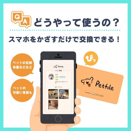 「Petfile Card」は、交通系ICカードや電子マネーなどに搭載されているNFCと呼ばれる機能を内蔵しており、カードをスマホにワンタッチするだけで、あなたの愛するペットをご紹介いただけます。