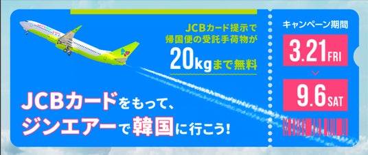 株式会社ジェーシービー(本社:東京都港区、代表取締役兼執行役員社長:二重 孝好、以下:JCB)は、株式会社ジンエアー(本社:韓国、代表:Byungryool Park、以下:ジンエアー)と、2025年3月21日(金)から9月6日(土)まで、ジンエアーの日本と韓国を結ぶ直行便の往復航空券を購入された方を対象として、日本および韓国の空港チェックイン時にJCBカードを提示すると、もれなく帰国便利用時(出発便除く)の受託手荷物が20kgまで無料になるキャンペーンを実施します。また、ジンエアー公式サイトではJCBカード会員様限定に日本発韓国行き往復航空券の割引や抽選で景品が当たるキャンペーンも実施いたします。