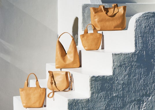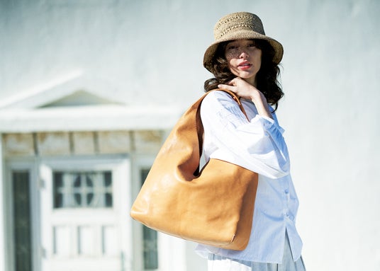 左から:トートバッグ中71,500円(税込)・かぶせ付きショルダーバッグ59,400円(税込)・ワンショルダー小79,200円(税込)・トートバッグ小55,000円(税込)・トートバッグ大108,900円(税込)