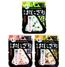 5年常温保存の美味しいおにぎり。100%国産米を使用したお湯または水を入れるだけでできる三角形の携帯おにぎり。手を汚さずに作って食べられる衛生的でめずらしい人気商品です。鮭の旨味が染み出る「鮭味」、磯の風味が美味しい「わかめ味」、しいたけやごぼうの旨味が人気の「五目おこわ」の3種のお買得セット。