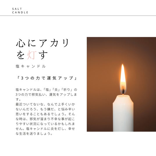 最近ついてないな、なんで上手くいかないんだろう、もう嫌だ、と悩み辛い思いをすることもあるでしょう。そんな時は、邪気が溜まり不幸な事が起こりやすい状況になっているかもしれません。塩キャンドルに炎を灯し、幸せな生活を送りましょう。