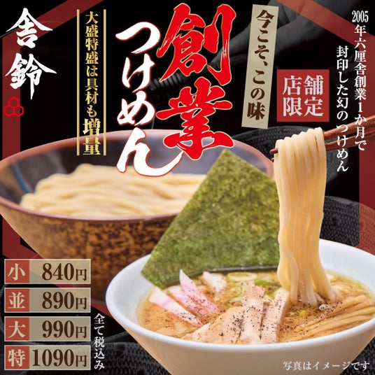 つけめん専門店「舎鈴(しゃりん)」は、現在2店舗限定で販売している「創業つけめん」(六厘舎で2005年創業時1か月で封印した幻のつけめん)を3/12(水)から更に6店舗で追加販売致します。