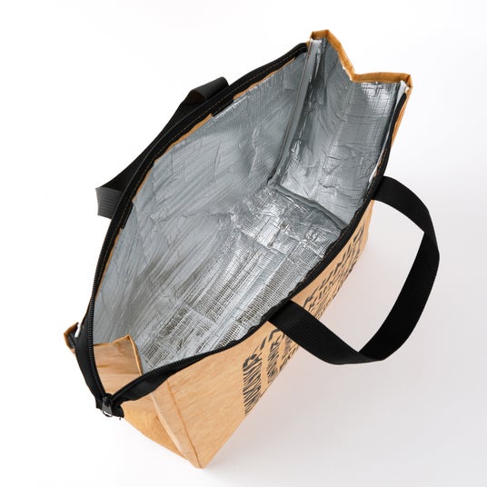 紙袋のようなナチュラルな手触りの素材を使用した保冷バッグ。お買い物やアウトドアシーンで活躍します。
