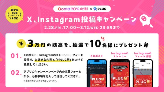 「メガ割」は、「Qoo10」が定期的に実施する人気のセールで、対象ブランドやアイテムを20%オフで購入できるお得なイベントです。今回の開催時期である3月は、新生活や新学期、入学・就職など、多くの人にとって重要なライフイベントが重なる季節です。多くの方がお買い物をするこの時期に合わせて「PLUG祭」を開催し、さらにお得にショッピングを楽しんでいただけるよう、PLUGを利用したキャッシュバック特典をご用意しました。