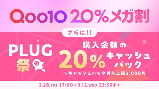 本キャンペーンでは、2025年2月28日(金)から3月12日(金)23:59までの期間中に『PLUG』を利用してQoo10でお買い物をされたお客様全員に、購入金額の20%のキャッシュバックを付与いたします。
