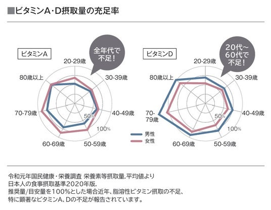 『A・D・E・K ミセル』は、ビタミンA、ビタミンD、ビタミンE、ビタミンKまで、4種類すべての脂溶性ビタミンを配合しています。中でも、日本人における摂取不足が報告されているビタミンAとビタミンDの摂取を重視した配合です。