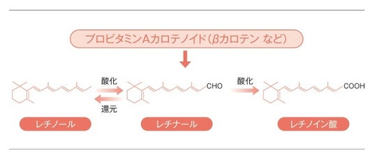 ビタミンAは、その構造の違いにより、レチノール、レチナール、レチノイン酸に分類されます。また、ビタミンAに変換されるβカロテンなどのプロビタミンAカロテノイド(ビタミンAの前駆体)も知られています。食事からは、ほぼレチノールとβカロテンの形で摂取され、必要に応じてレチナール、レチノイン酸に変換して利用されますが、体内ではほとんどがレチノールとして存在しているため、摂取する際もレチノールでの摂取が効率的だと考えられます。