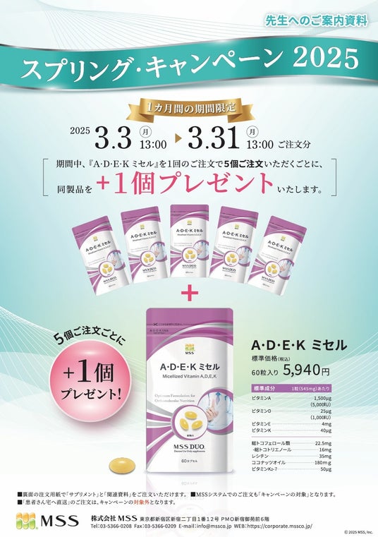 医療機関専用サプリメントの開発・製造・卸販売のほか、医療機関におけるオーソモレキュラー栄養療法の導入・実践をトータルサポートする株式会社MSSでは、2025年3月3日(月)13:00~3月31日(月)13:00まで、「スプリング・キャンペーン 2025」を開催しています。