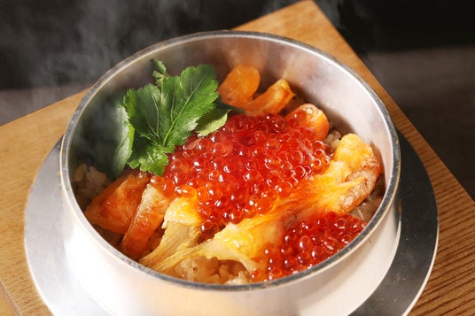 弾けるいくらをたっぷり添え、魚介の旨みがたっぷりの贅沢な釜飯。