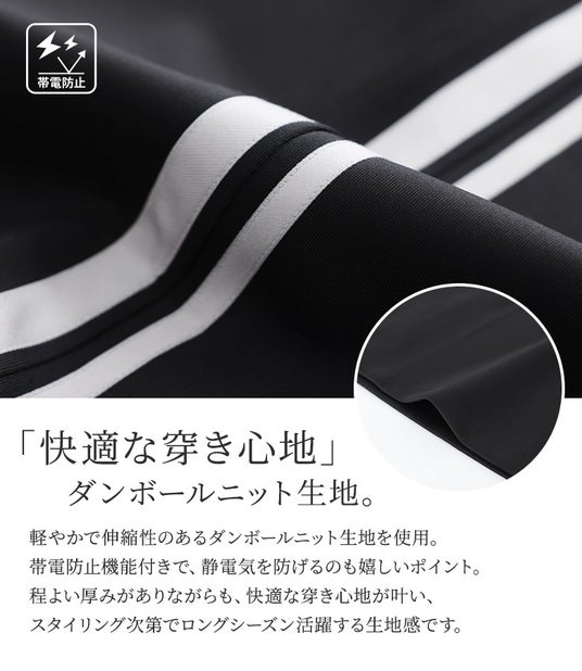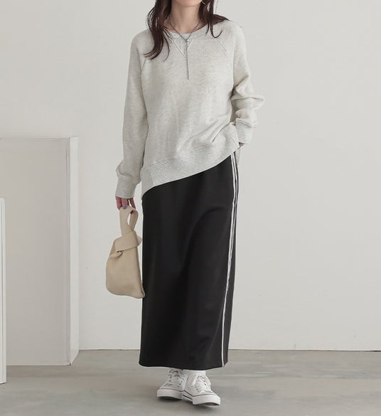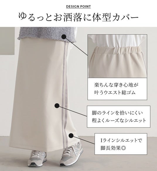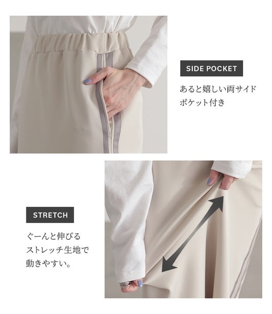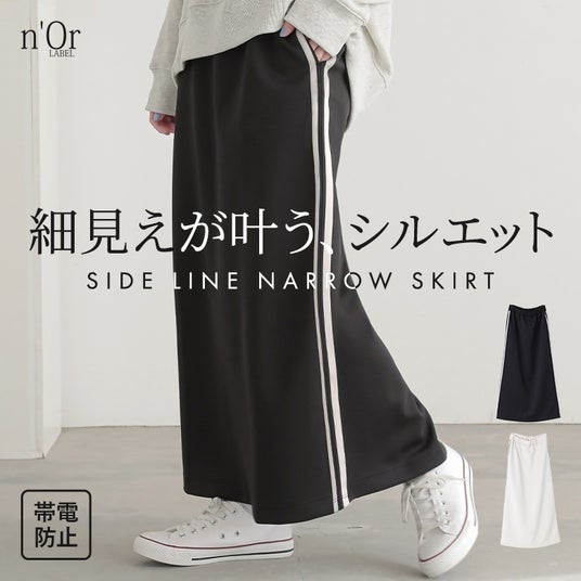 太さが異なるサイドラインが、コーデにアクセントを効かせてくれる、楽ちんな穿き心地のナロースカート。