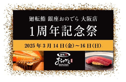 株式会社ONODERAフードサービス(代表取締役社長:小野寺 勇司 所在地:東京都千代田区)が運営する「廻転鮨 銀座おのでら 大阪店」は、2025年3月14日(金)から3月16日(日)まで日頃のお客様のご愛顧に感謝を込めて、「1周年記念祭」を開催いたします。