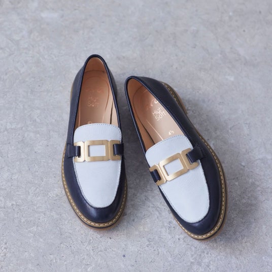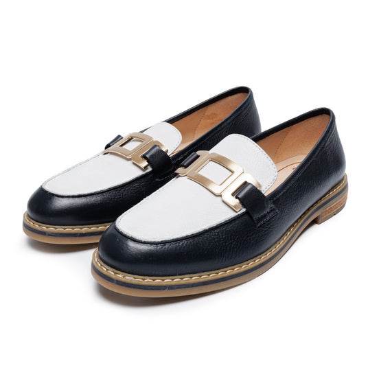 洗練された印象を与えてくれる白とネイビーが目を惹くローファー。ゴールドのビットがさりげない高級感をプラスし、スタイリッシュなデザインとバランスの良さが魅力です。白の爽やかさとネイビーのシックな印象が大人女性にマッチする、季節を問わず活躍しやすい一足です。