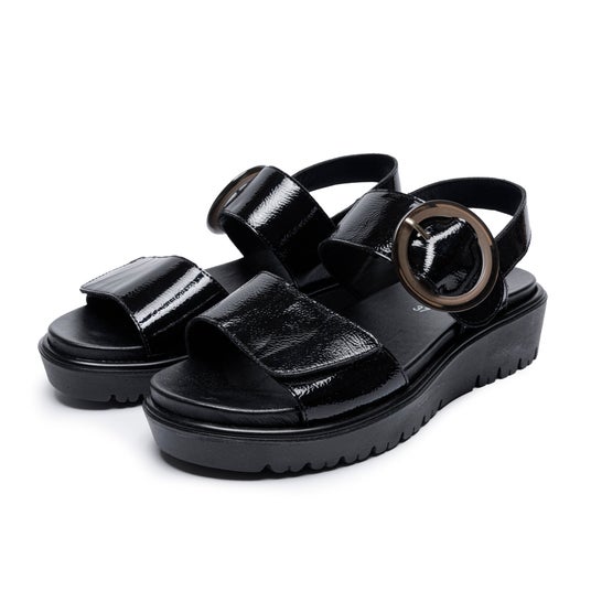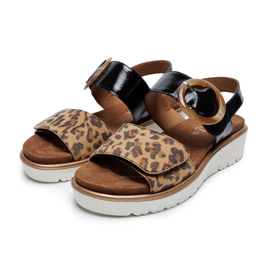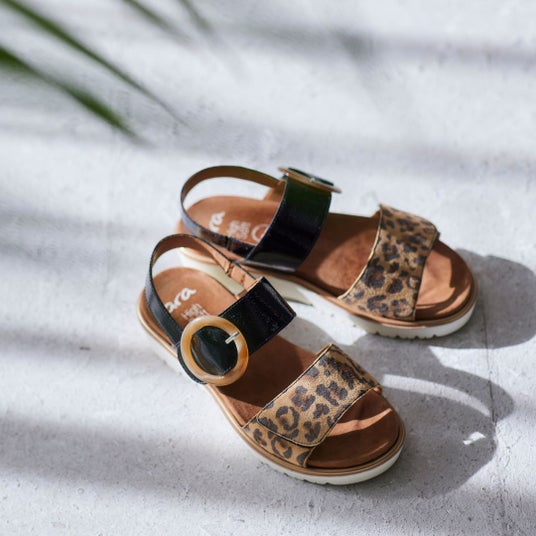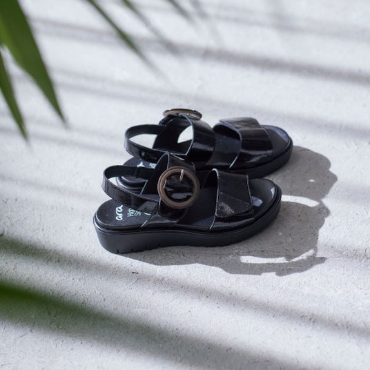 丸いバックルがアクセントになり、夏の装いをワンランク上に仕上げてくれるサンダルたち。遊び心のあるレオパードとシックなオールブラックの2色展開です。柔らかなエナメルレザーと足裏がフィットしやすいインソールを使用しているため、素足でも負担なく履くことができます。